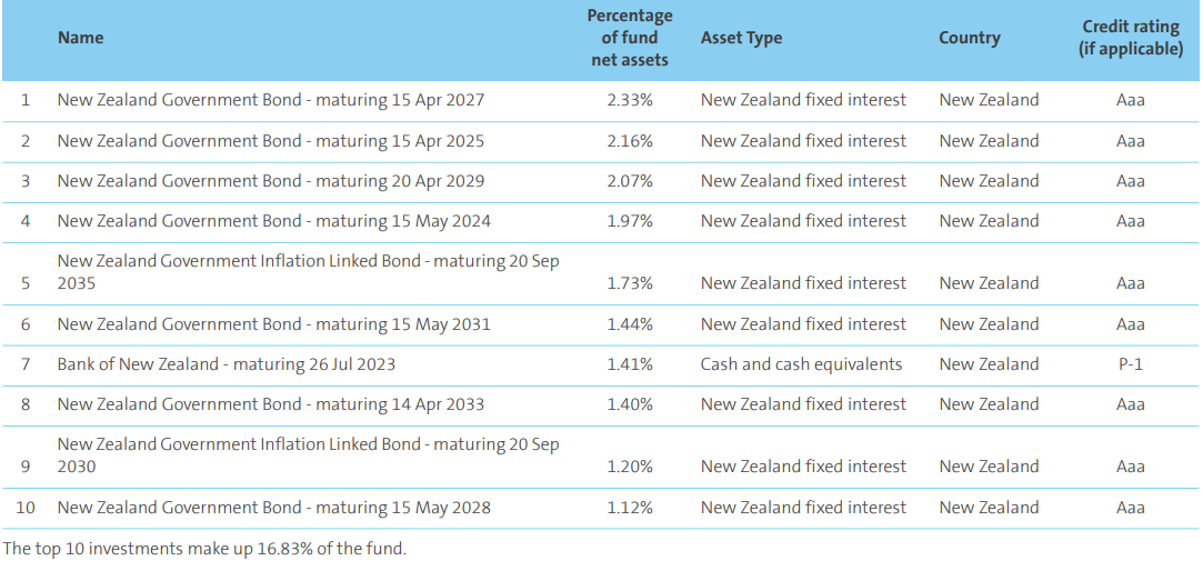 This table shows AMP´s top 10 investments in the Conservative KiwiSaver Fund, which make up 16.83% of the fund.