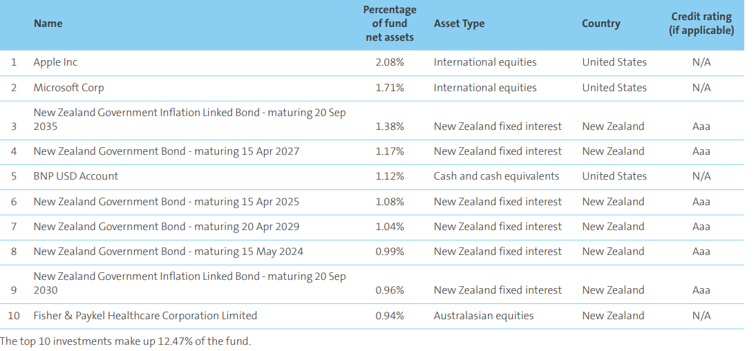 This table shows AMP´s top 10 investments in the Balanced KiwiSaver Fund, which make up 12.47% of the fund.