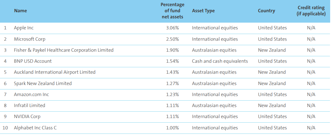 This table shows AMP´s top 10 investments in the Aggressive KiwiSaver Fund, which make up 16.15% of the fund.