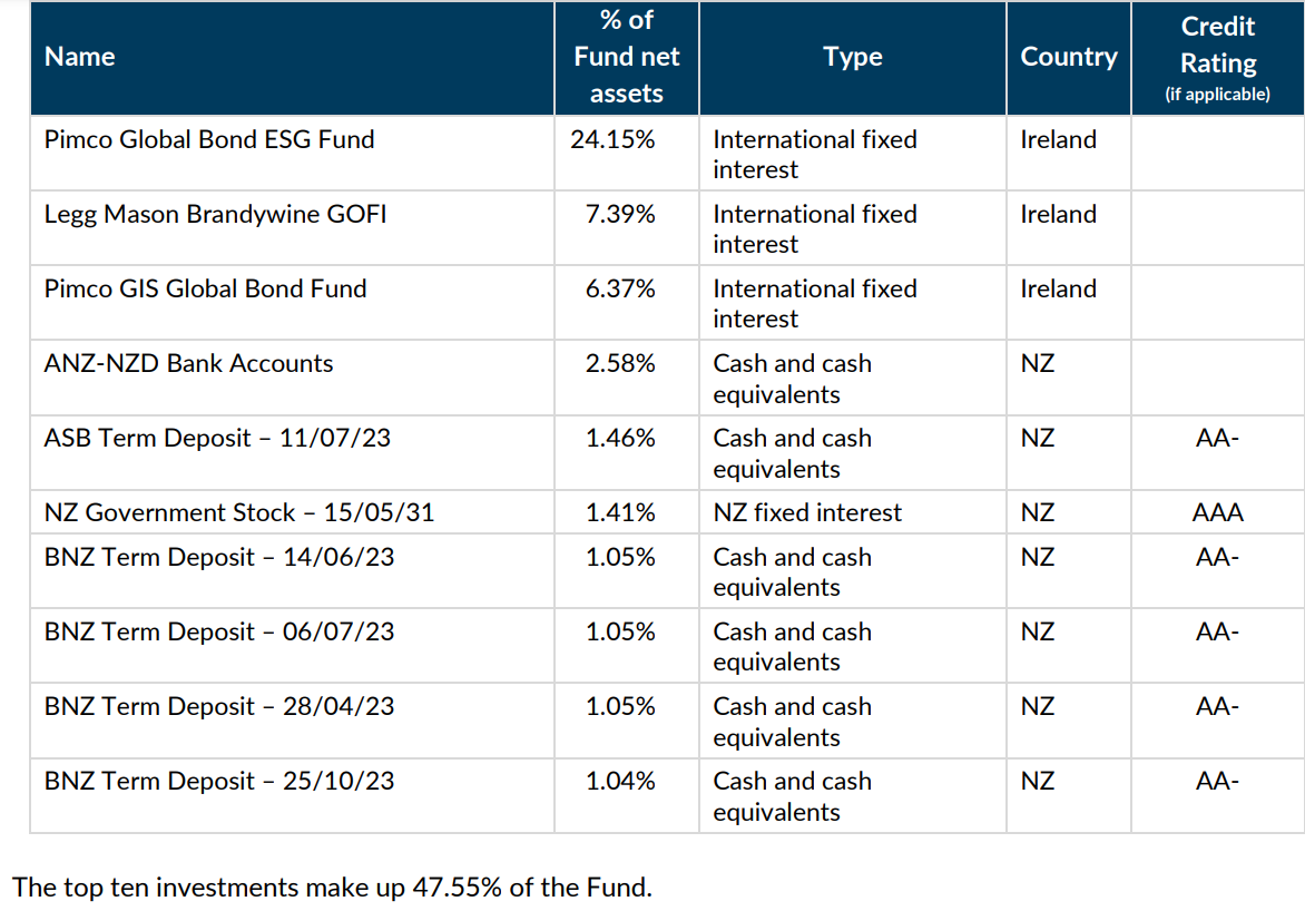 This table shows Christian’s top 10 investments in the Income KiwiSaver Fund, which comprise 47.55% of the fund.