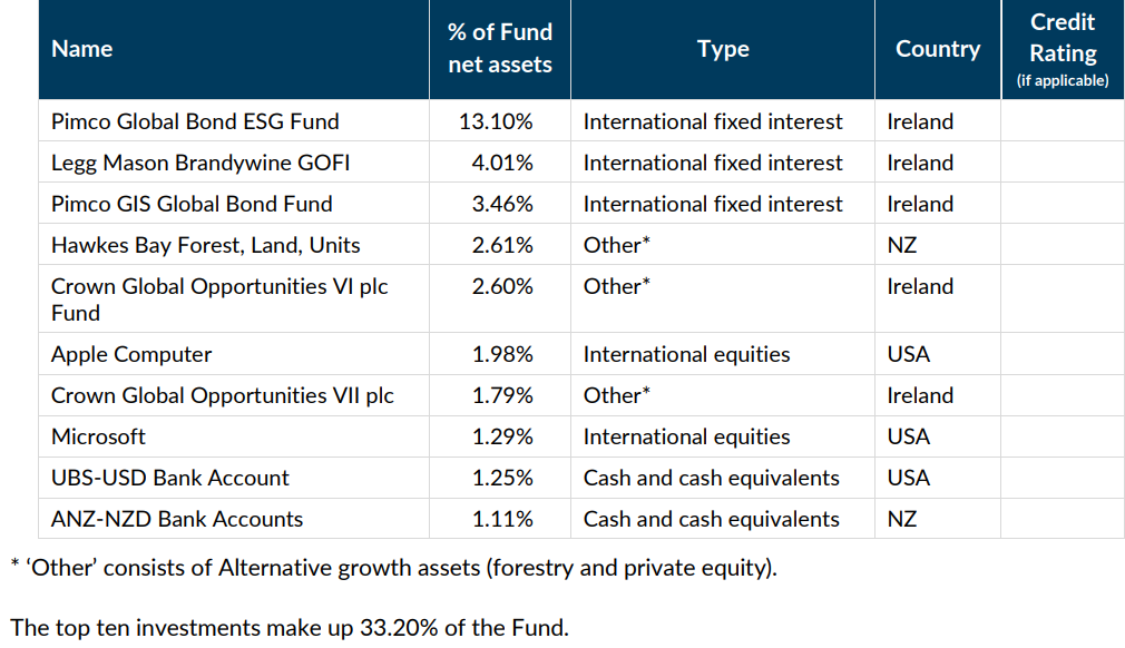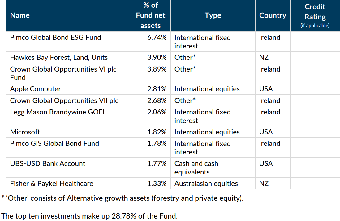 This table shows Christian’s top 10 investments in the Balanced KiwiSaver Fund, which comprise 33.20% of the fund.