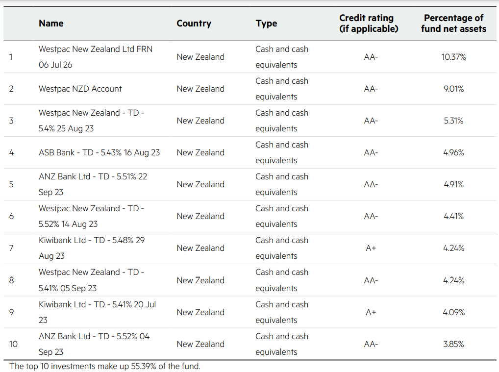 This table shows Kiwi Wealth’s top 10 investments in the Cash KiwiSaver Fund, which make up 55.39% of the fund.