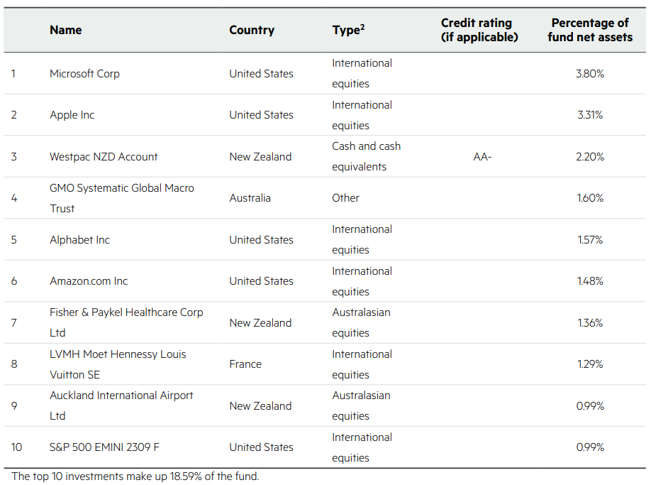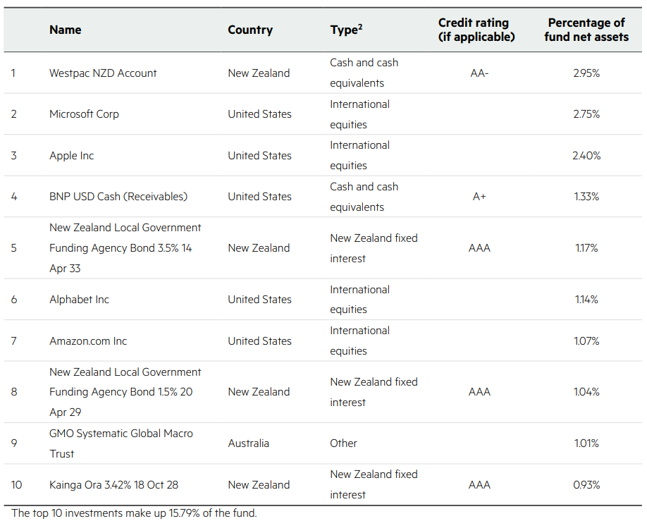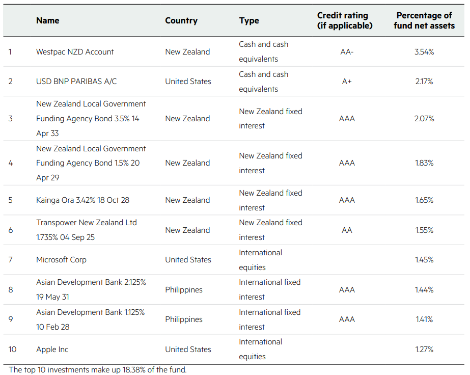 This table shows Kiwi Wealth’s top 10 investments in the Balanced KiwiSaver Fund, which comprise 15.79% of the fund.