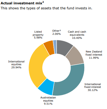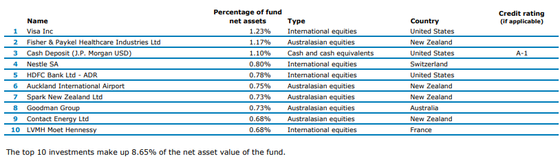 This table shows OneAnswer´s top 10 investments in the Balanced KiwiSaver Fund, which make up 8.71% of the fund.