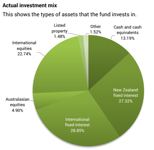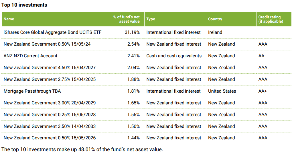 This table shows SuperLife’s top 10 investments in the Conservative KiwiSaver Fund, which comprise 44.22% of the fund.
