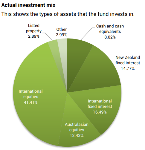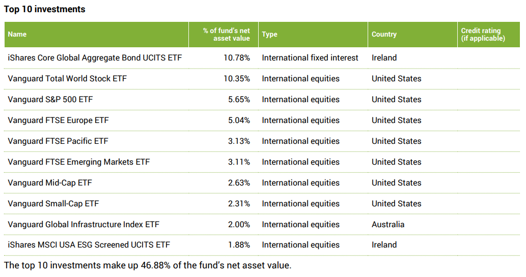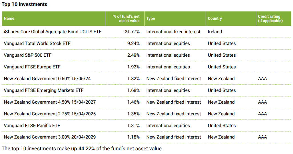 This table shows SuperLife’s top 10 investments in the Balanced KiwiSaver Fund, which comprise 46.88% of the fund.