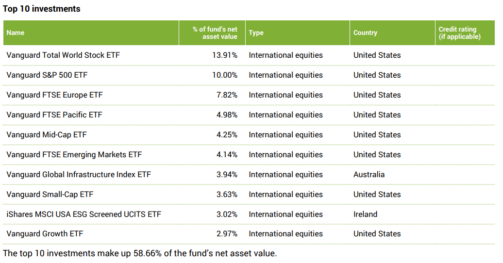 This table shows SuperLife’s top 10 investments in the High Growth KiwiSaver Fund, which make up 58.66% of the fund.